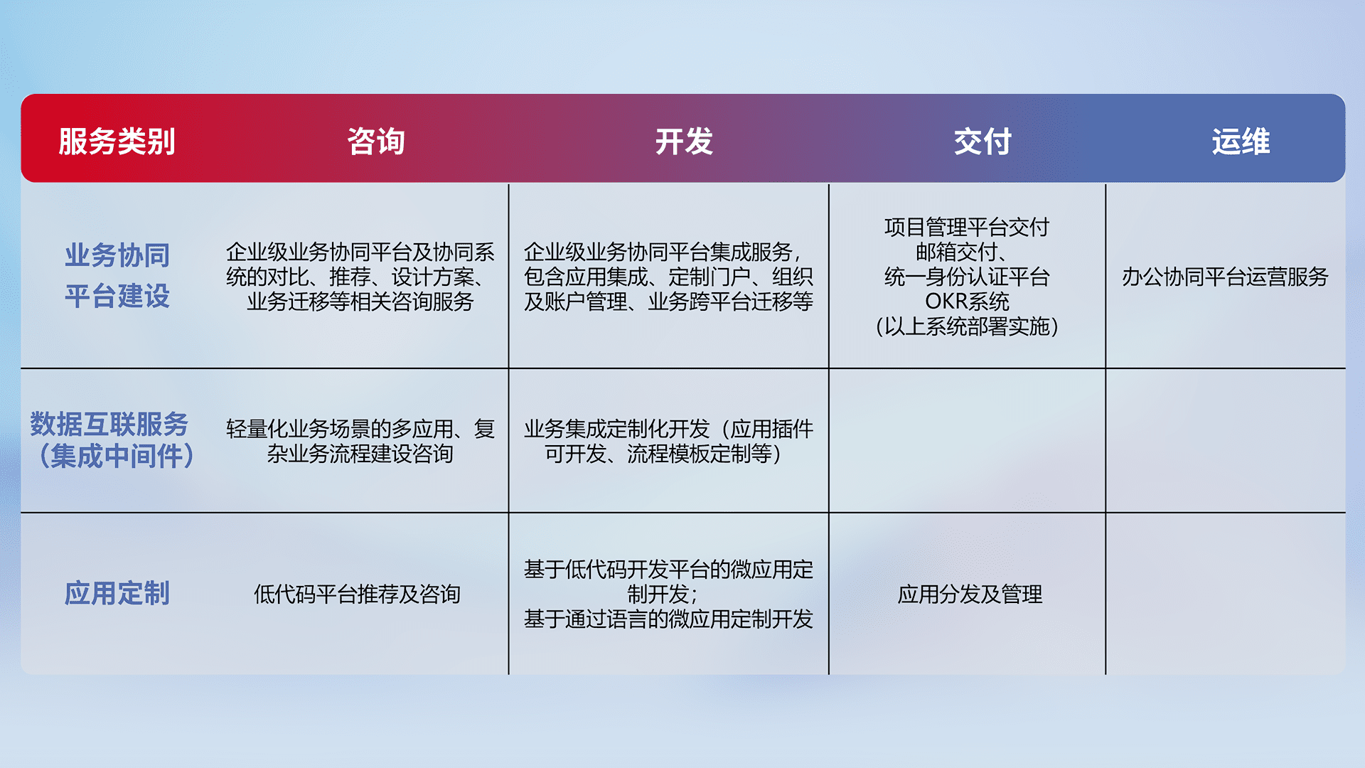 针对钉钉、、、企微、、IDaas等平台级产品提供产品的规划、、、、方案、、、、交付、、定制化开发等服务,,,,实现如统一协同办公、、、、智能客户服务、、混合会议管理、、智能数据查询、、、等业务场景,,,实现数字化转型。。。。